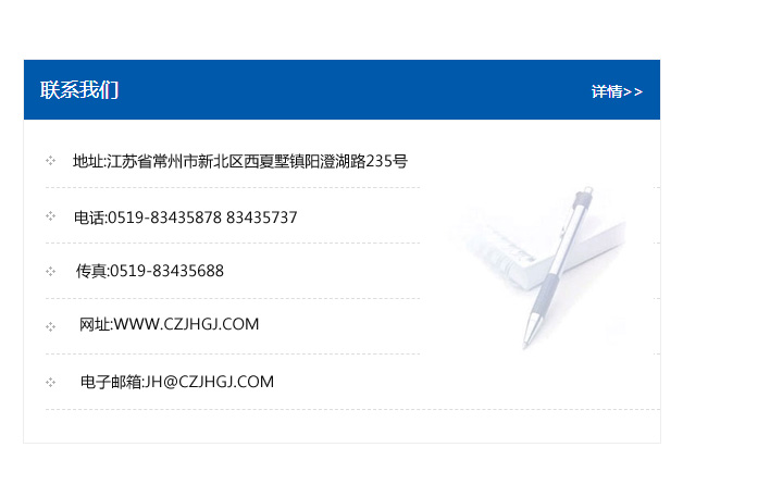 地址:常州市新北區友邦商務大廈1幢16、17層  電話:0519-85101652  傳真:0519-85112595  郵編:213022  網址:www_cz-jiayue_cn.2000wy.com  郵箱:xiajifengaa@163.com